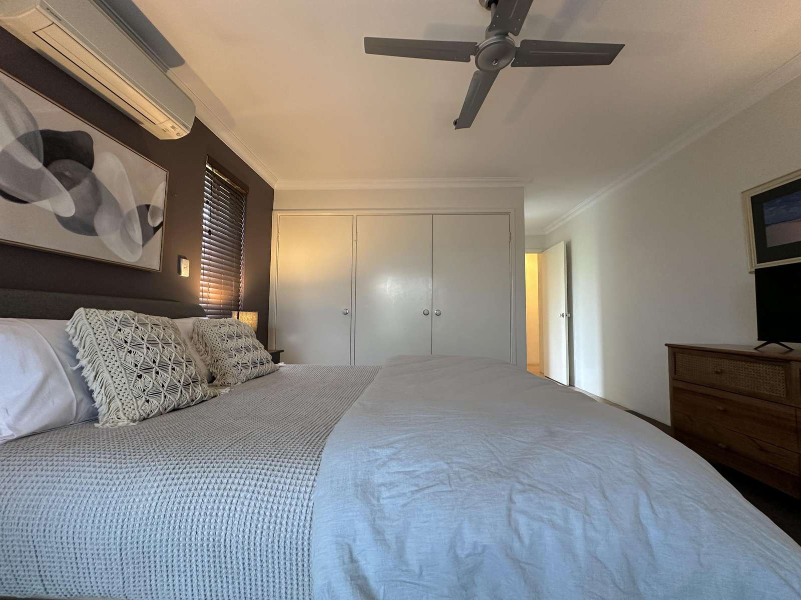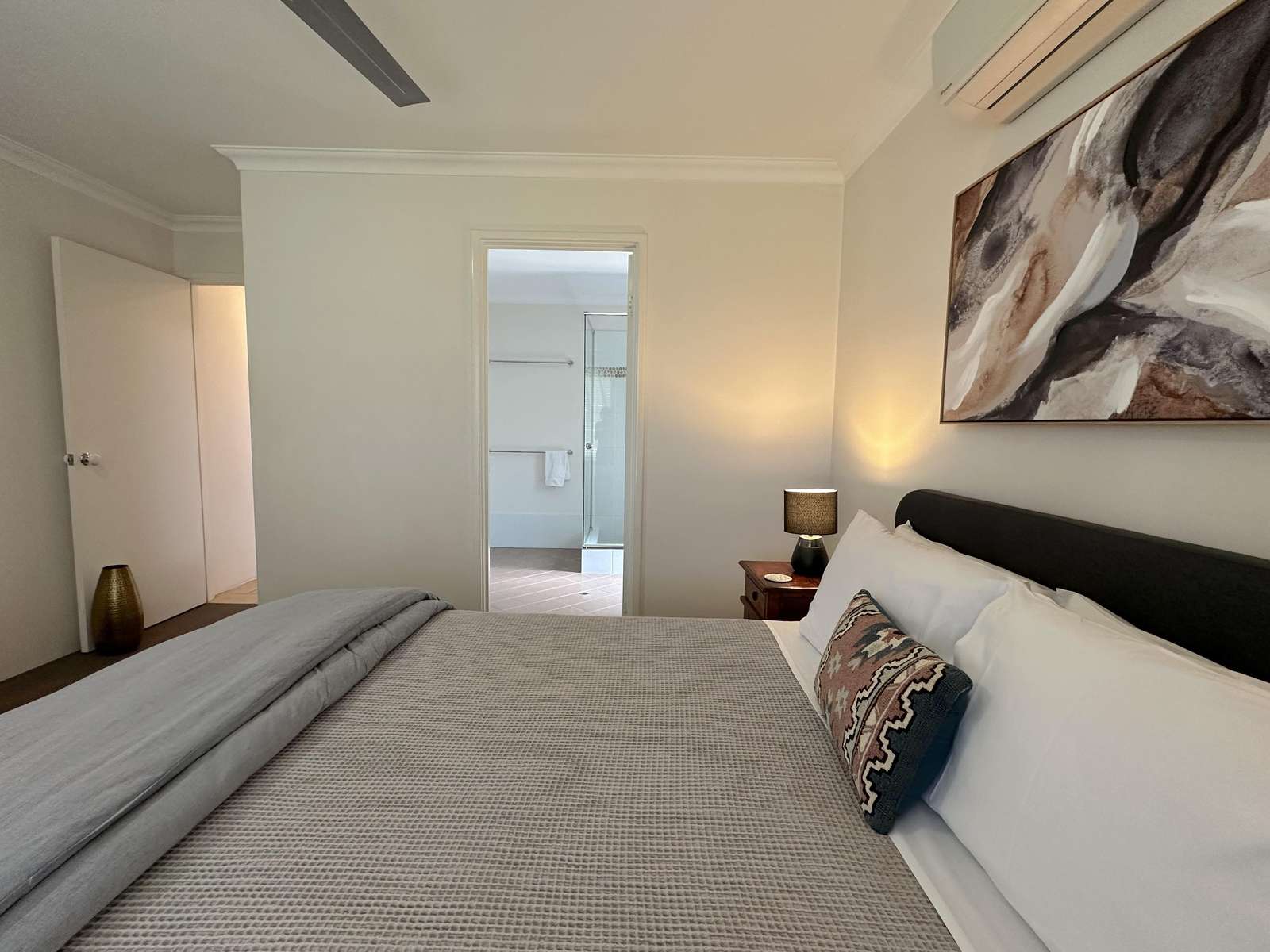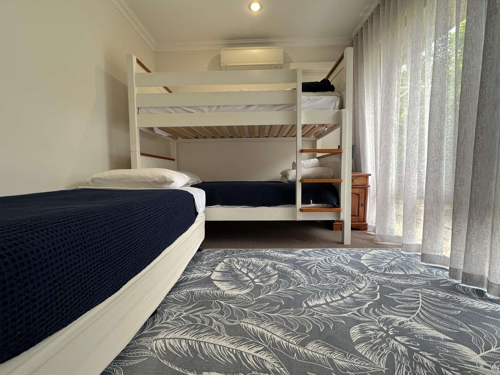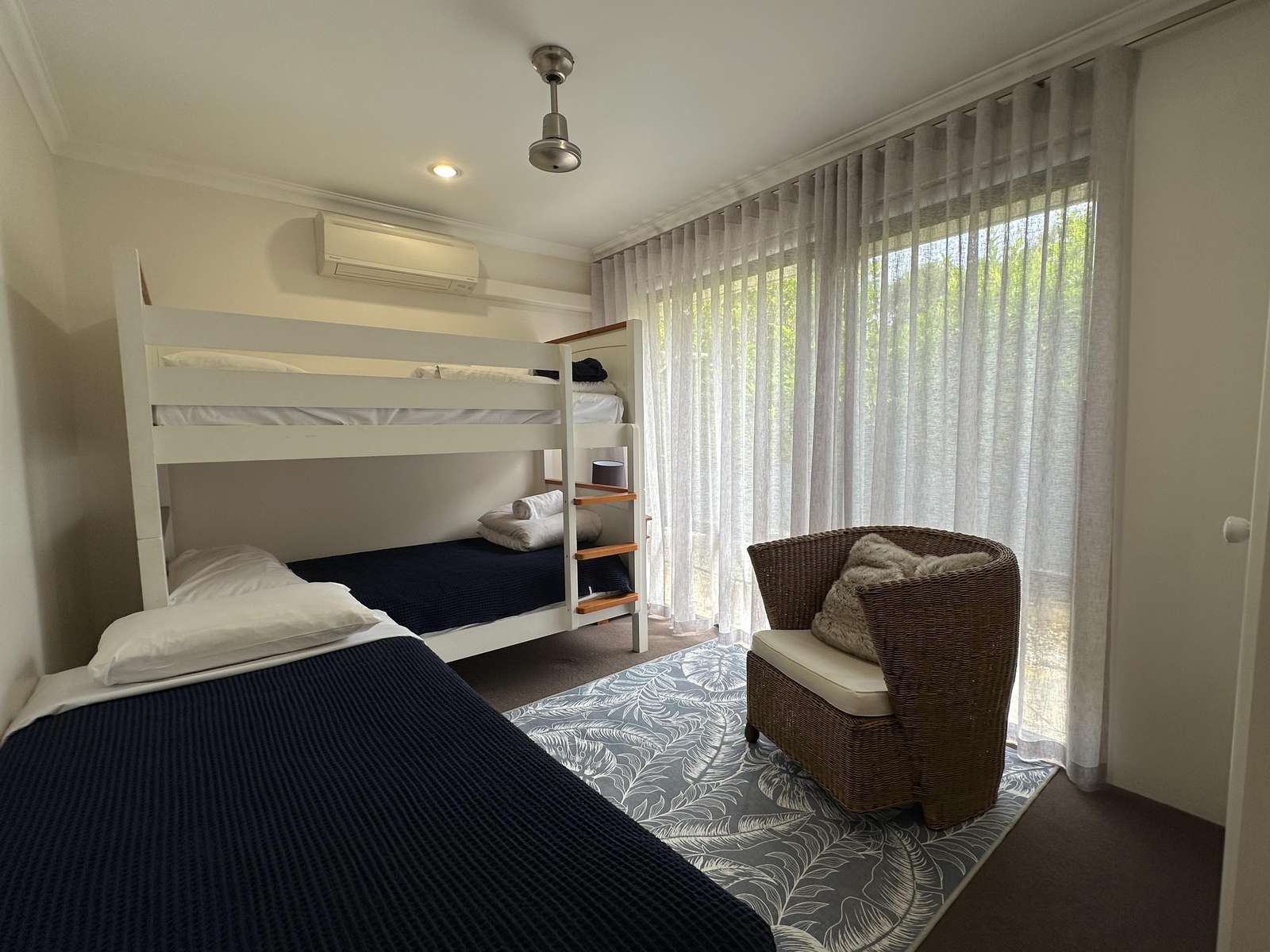 Master has Queen bed with Netflix enabled TV, ensuite with spa bath and shower and seperate toilet. This room opens out with a sliding door to the deck, where comfy chairs await. The second bedroom has Queen bed and ensuite access to the second bathroom. Third bedroom has 3 singles and accesses the second bathroom from the hallway through the hallway door (jack and jill bathroom). All bedrooms have a/c for comfort.