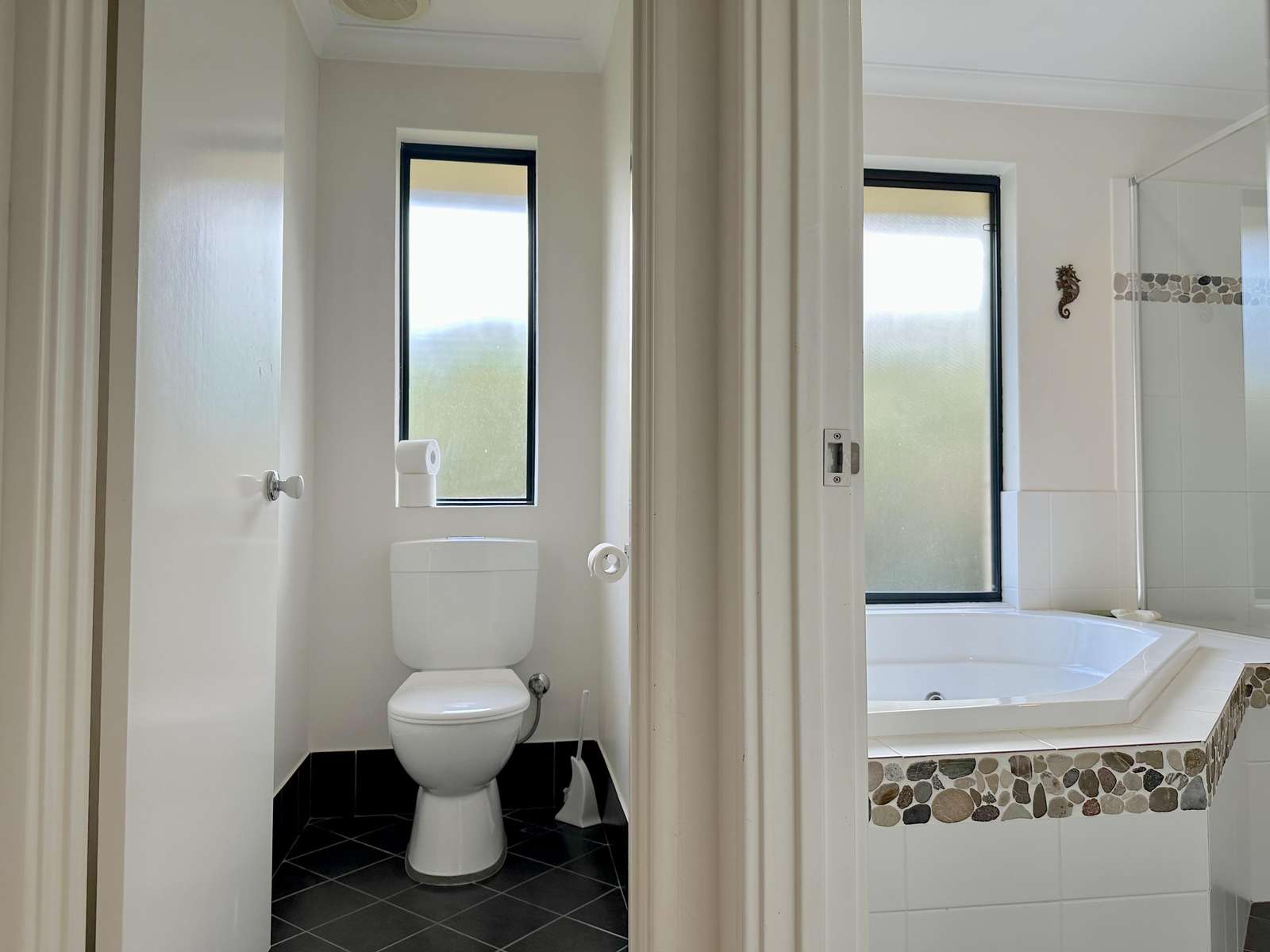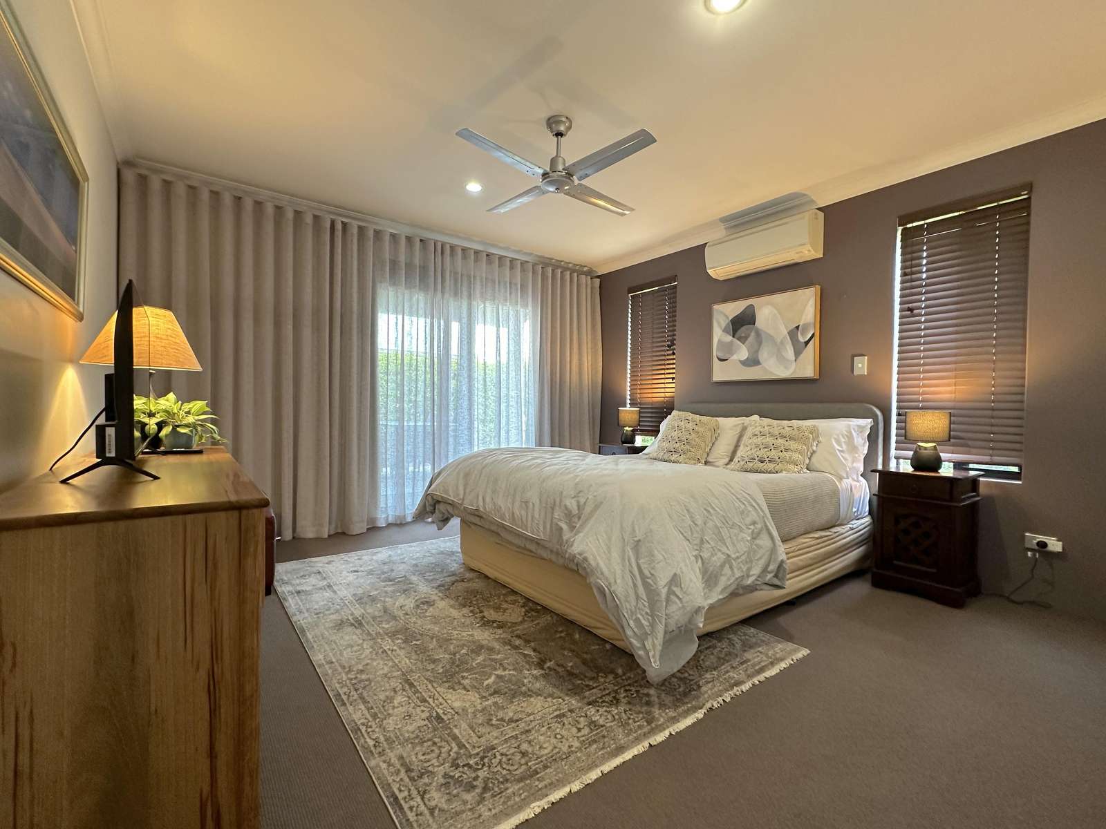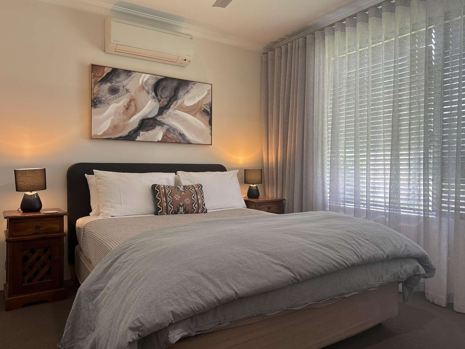 Master has Queen bed with Netflix enabled TV, ensuite with spa bath and shower and seperate toilet. This room opens out with a sliding door to the deck, where comfy chairs await. The second bedroom has Queen bed and ensuite access to the second bathroom. Third bedroom has 3 singles and accesses the second bathroom from the hallway through the hallway door (jack and jill bathroom). All bedrooms have a/c for comfort.