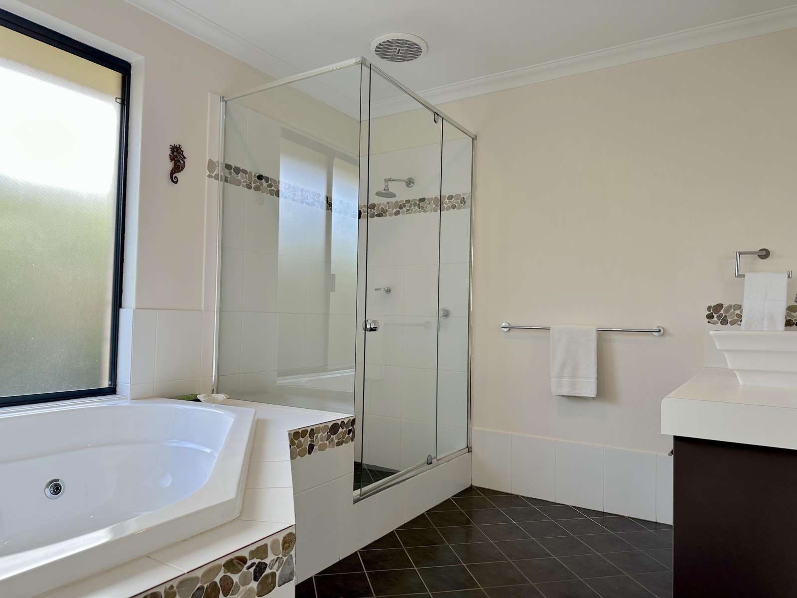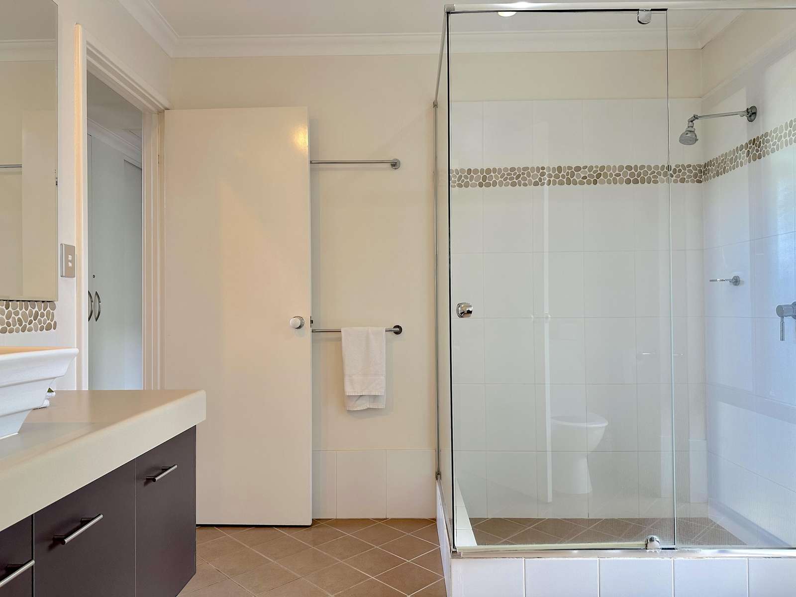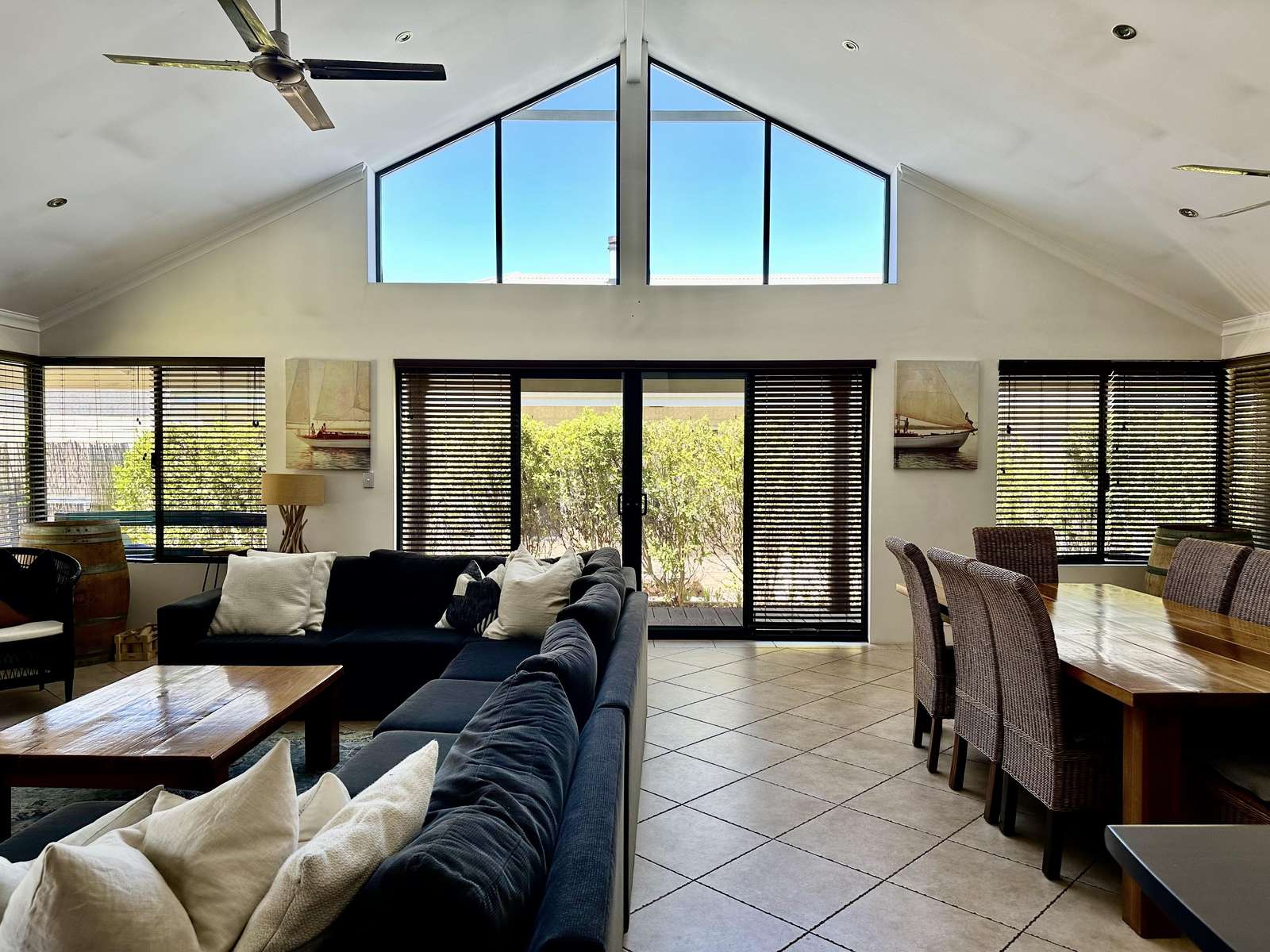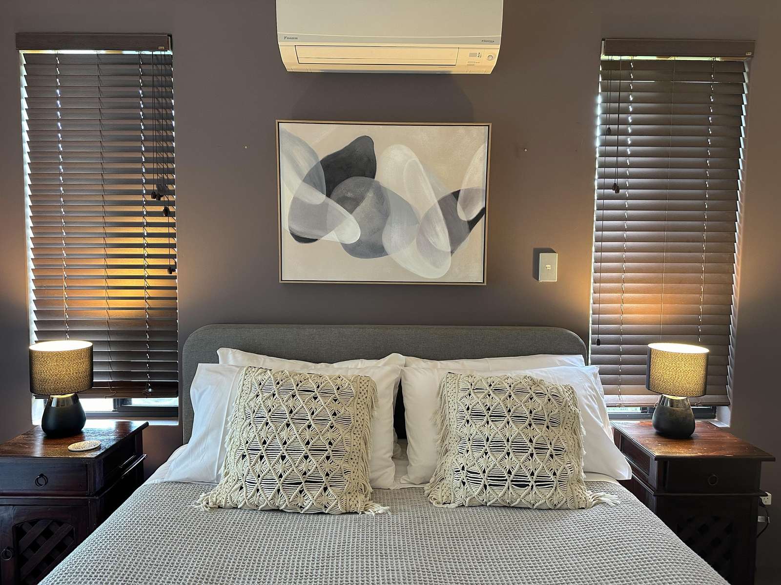 Master has Queen bed with Netflix enabled TV, ensuite with spa bath and shower and seperate toilet. This room opens out with a sliding door to the deck, where comfy chairs await. The second bedroom has Queen bed and ensuite access to the second bathroom. Third bedroom has 3 singles and accesses the second bathroom from the hallway through the hallway door (jack and jill bathroom). All bedrooms have a/c for comfort.